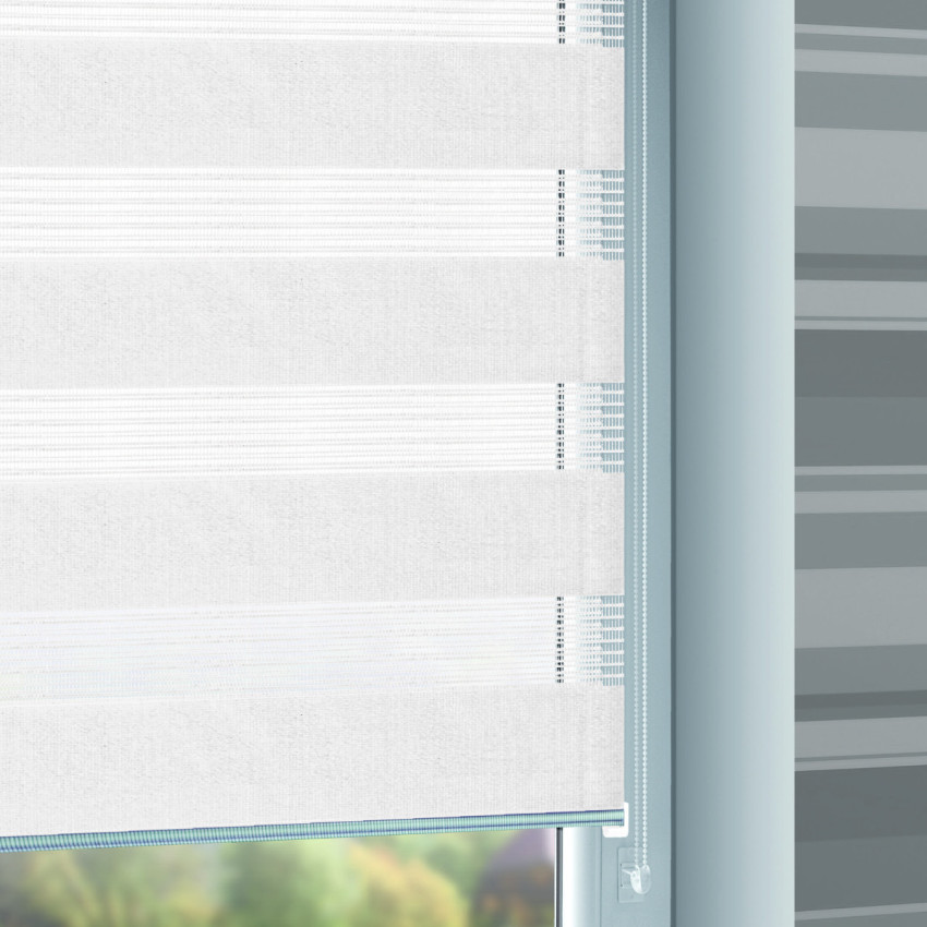 Roleta dzień noc biała 80/150 typu mini do instalowania na skrzydle okna. Montaż na skrzydle przy pomocy zaciskowych wieszaków naokiennych lub samoprzylepnych płytek montażowych. Tkanina poliestrowa tkana na przemian gęstym i rzadkim splotem. Podwójne przewinięcie tkaniny daje możliwość ustawiania względem siebie ciemnych i jasnych pasów, dzięki czemu można w sposób płynny regulować ilość przepuszczanego światła.