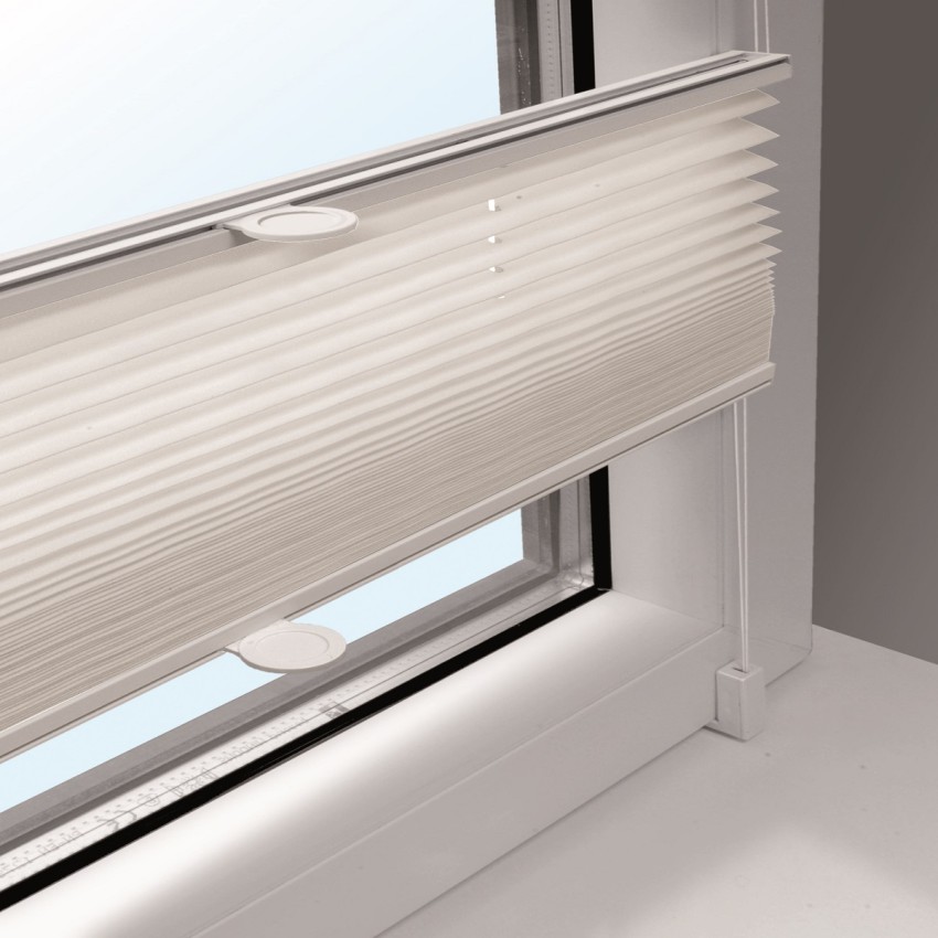 Roleta plisa biała 42,5/150 mini Verona z dwoma ruchomymi belkami do bezinwazyjnego montażu na skrzydle okna.